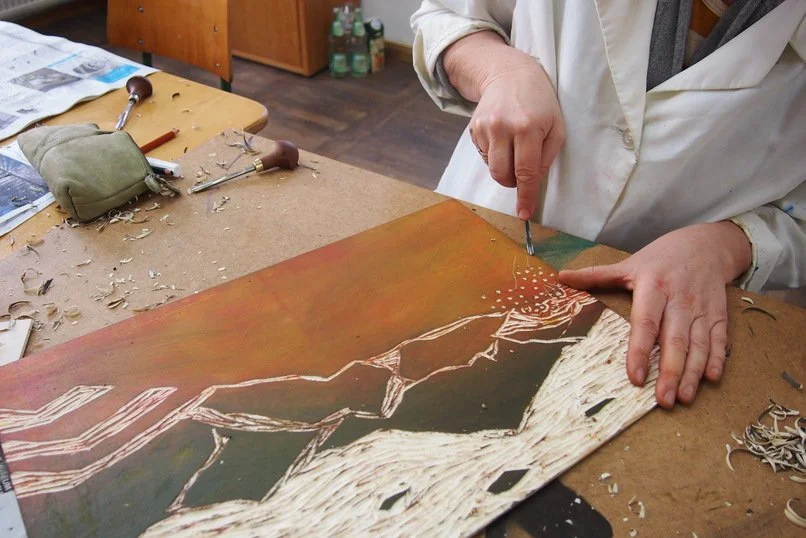 Der Holzschnitt ist ein klassisches Hochdruckverfahren mit besonderem Reiz durch das Material Holz. Hohe, unbearbeitete Stellen bleiben im Druckbild sichtbar, wie auch oft die Maserung des Holzes selbst. Diese lässt die Fläche lebendig erscheinen. Über das Anfertigen eines Druckstockes werden Geschicklichkeit, Flächenverständnis und das Gespür für die Laufrichtung des Holzes herausgefordert. Eigene Motive können umgesetzt werden.